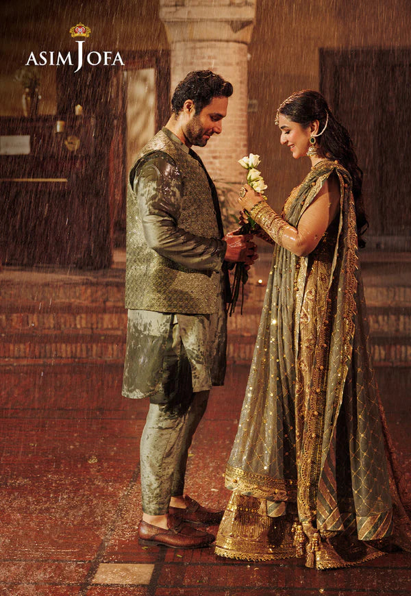 Unveil the splendor of this exquisite beige peshwas with a sage green dupatta, a masterpiece that captures the essence of royalty and vintage allure. The embroidery on this ensemble is akin to chapters in a timeless saga intricately crafted with tonal-dyed aari thread that adds a unique depth to the design. Adorned with shimmering gold 9mm, 5mm, and 3mm sequins that glisten. The lurex and threadwork in hues of beige and rust further enhance the richness of the ensemble making it a radiant symbol of regality and elegance. Step into the spotlight and make a statement this Eid with this captivating peshwas from Asim Jofa's "Chikankari" collection.
